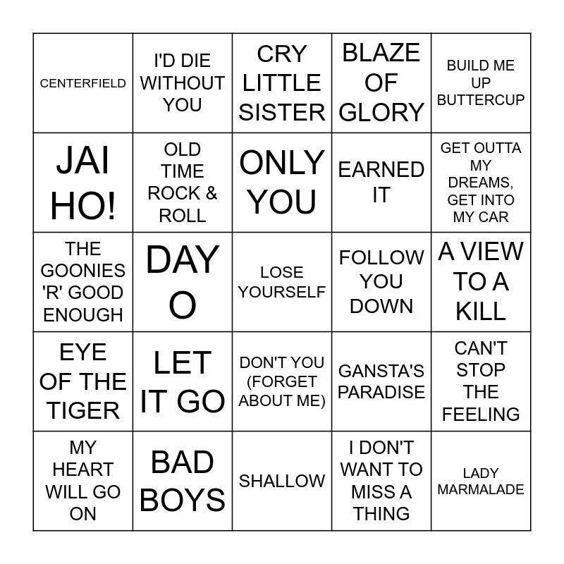 This bingo card has 69 words: (I'VE HAD) THE TIME OF MY LIFE, A VIEW TO A KILL, ARTHUR'S THEME, AXEL F, BAD BOYS, BALLROOM BLITZ, BLAZE OF GLORY, BORN SLIPPY, BUILD ME UP BUTTERCUP, CAN'T FIGHT THE MOONLIGHT, CAN'T STOP THE FEELING, CANNED HEAT, CENTERFIELD, CRY LITTLE SISTER, CUPS, DAY O, DON'T YOU (FORGET ABOUT ME), EARNED IT, EVERYBODY WANTS TO RULE THE WORLD, EYE OF THE TIGER, FOLLOW YOU DOWN, GANSTA'S PARADISE, GET OUTTA MY DREAMS, GET INTO MY CAR, GHOSTBUSTERS, GLORY OF LOVE, HAPPY, HOLD MY HAND, HOLD ON, I DON'T WANT TO MISS A THING, I SAY A LITTLE PRAYER, I'D DIE WITHOUT YOU, I'M A BELIEVER, I'M ALRIGHT, IF YOU LEAVE, IN YOUR EYES, INDEPENDENT WOMEN, IT HAD TO BE YOU, IT MUST HAVE BEEN LOVE, JAI HO!, LADY MARMALADE, LET IT GO, LOSE YOURSELF, MAMA MIA, MANIAC, MILKSHAKE, MY HEART WILL GO ON, NEVER ENDING STORY, NOTHING'S GONNA STOP US NOW, OH YEAH, OLD TIME ROCK & ROLL, ONLY YOU, PRETTY IN PINK, SECRET GARDEN, SHALLOW, SHE, STAND BY ME, STUCK IN THE MIDDLE WITH YOU, SUPERMASSIVE BLACK HOLE, SWEET CAROLINE, THE GOONIES 'R' GOOD ENOUGH, THE POWER OF LOVE, WE DON'T NEED ANOTHER HERO, WHAT IS LOVE, WILD THING, XANADU, YOU COULD BE MINE, YOU NEVER CAN TELL, YOU'RE THE BEST and YOU'VE GOT A FRIEND IN ME.
