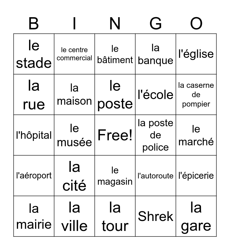 This bingo card has a free space and 25 words: la cité, la tour, le poste, la mairie, l'église, le stade, la rue, le centre commercial, la poste de police, le magasin, l'école, l'hôpital, l'autoroute, l'épicerie, la maison, la bibliothèque, le marché, le bâtiment, la caserne de pompier, le musée, la gare, la ville, l'aéroport, la banque and Shrek.