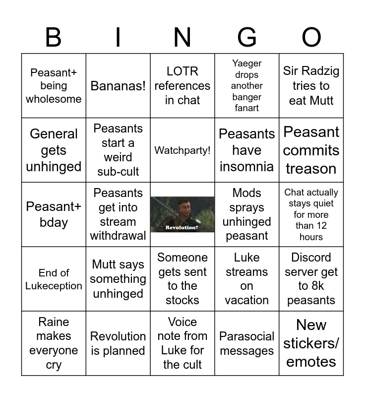 This bingo card has a free space and 24 words: Mutt says something unhinged, Revolution is planned, Watchparty!, Raine makes everyone cry, Sir Radzig tries to eat Mutt, Peasant+ being wholesome, General gets unhinged, Bananas!, Mods sprays unhinged peasant, Someone gets sent to the stocks, Peasants have insomnia, Peasant+ bday, Luke streams on vacation, Discord server get to 8k peasants, Peasants start a weird sub-cult, Parasocial messages, Chat actually stays quiet for more than 12 hours, LOTR references in chat, Peasant commits treason, Peasants get into stream withdrawal, New stickers/ emotes, End of Lukeception, Yaeger drops another banger fanart and Voice note from Luke for the cult.