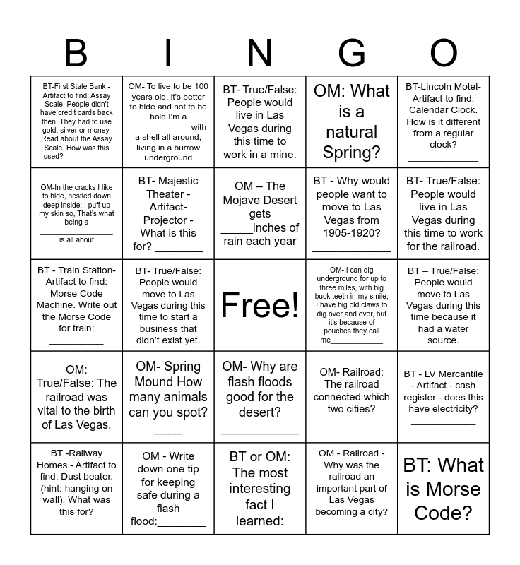 This bingo card has a free space and 24 words: OM- Spring Mound How many animals can you spot? ____, OM - Write down one tip for keeping safe during a flash flood:________, OM – The Mojave Desert gets _____inches of rain each year, BT -Railway Homes - Artifact to find: Dust beater. (hint: hanging on wall). What was this for? ____________, BT-Lincoln Motel- Artifact to find: Calendar Clock. How is it different from a regular clock? _____________, BT-First State Bank - Artifact to find: Assay Scale. People didn't have credit cards back then. They had to use gold, silver or money. Read about the Assay Scale. How was this used? ___________, OM-In the cracks I like to hide, nestled down deep inside; I puff up my skin so, That’s what being a __________________ is all about, OM- To live to be 100 years old, it’s better to hide and not to be bold I’m a _____________with a shell all around, living in a burrow underground, OM- I can dig underground for up to three miles, with big buck teeth in my smile; I have big old claws to dig over and over, but it’s because of pouches they call me_____________, OM- Why are flash floods good for the desert? ___________, BT - Why would people want to move to Las Vegas from 1905-1920? _____________, BT - Train Station-Artifact to find: Morse Code Machine. Write out the Morse Code for train: __________, OM- Railroad: The railroad connected which two cities? ______________, BT - LV Mercantile - Artifact - cash register - does this have electricity? ____________, BT- Majestic Theater - Artifact- Projector - What is this for? ________, OM - Railroad - Why was the railroad an important part of Las Vegas becoming a city? _______, BT – True/False: People would move to Las Vegas during this time because it had a water source., BT- True/False: People would live in Las Vegas during this time to work in a mine., BT- True/False: People would live in Las Vegas during this time to work for the railroad., BT- True/False: People would move to Las Vegas during this time to start a business that didn’t exist yet., BT: What is Morse Code?, OM: True/False: The railroad was vital to the birth of Las Vegas., OM: What is a natural Spring? and BT or OM: The most interesting fact I learned:.