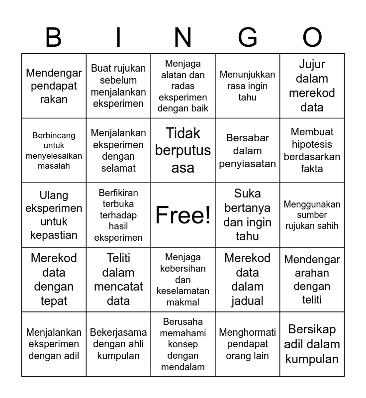 This bingo card has a free space and 24 words: Teliti dalam mencatat data, Bekerjasama dengan ahli kumpulan, Tidak berputus asa, Menjalankan eksperimen dengan adil, Jujur dalam merekod data, Mendengar pendapat rakan, Berbincang untuk menyelesaikan masalah, Buat rujukan sebelum menjalankan eksperimen, Suka bertanya dan ingin tahu, Menjaga kebersihan dan keselamatan makmal, Bersabar dalam penyiasatan, Ulang eksperimen untuk kepastian, Merekod data dalam jadual, Mendengar arahan dengan teliti, Menjalankan eksperimen dengan selamat, Menghormati pendapat orang lain, Menggunakan sumber rujukan sahih, Menjaga alatan dan radas eksperimen dengan baik, Membuat hipotesis berdasarkan fakta, Berfikiran terbuka terhadap hasil eksperimen, Bersikap adil dalam kumpulan, Merekod data dengan tepat, Menunjukkan rasa ingin tahu and Berusaha memahami konsep dengan mendalam.