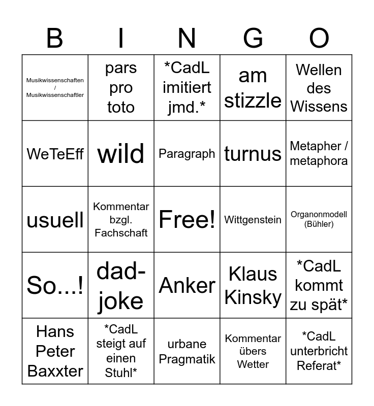 This bingo card has a free space and 24 words: dad-joke, *CadL steigt auf einen Stuhl*, Paragraph, Hans Peter Baxxter, Wellen des Wissens, Musikwissenschaften / Musikwissenschaftler, WeTeEff, pars pro toto, Wittgenstein, Anker, turnus, usuell, Klaus Kinsky, *CadL kommt zu spät*, wild, Kommentar übers Wetter, Organonmodell (Bühler), *CadL imitiert jmd.*, Metapher / metaphora, Kommentar bzgl. Fachschaft, *CadL unterbricht Referat*, So...!, am stizzle and urbane Pragmatik.