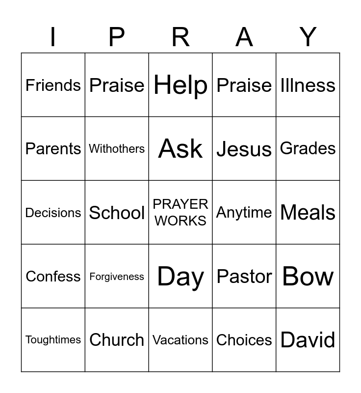 This bingo card has a free space and 65 words: Pray, Prayer, Kneel, Bow, Silent, Handsraised, Praise, Repent, Ask, Yield, Day, Night, Meals, Illness, Leaders, Parents, School, Friends, God, Jesus, Forgiveness, Confess, Praise, Thanksgiving, Prayinghands, Eyesopen, Eyesclosed, Hannah, David, Paul, Toughtimes, Standing, Teachers, President, Pastor, Church, Worship, Decisions, Choices, Alone, Withothers, Anywhere, Anytime, Christians, Solomon, Money, Grades, Sadness, Happiness, Celebration, Bullies, Sports, Activities, Vacations, Safety, Protection, Provision, Help, Pain, Success, Leap, Other, Health, Attitude and Selfworth.