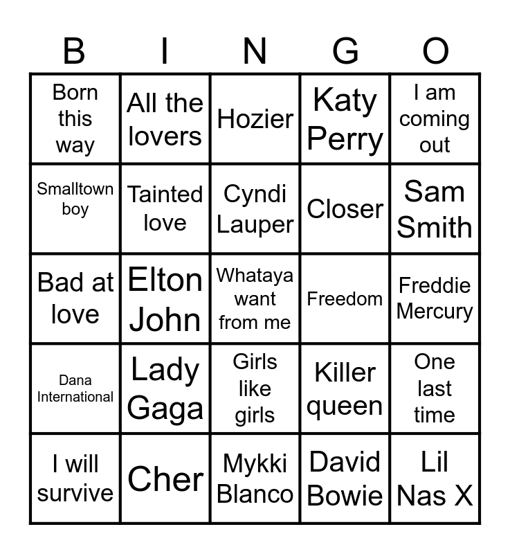 This bingo card has a free space and 24 words: Lady Gaga, Cher, Cyndi Lauper, I will survive, I am coming out, Born this way, Smalltown boy, All the lovers, Freedom, Girls like girls, Closer, Bad at love, Killer queen, One last time, Tainted love, David Bowie, Freddie Mercury, Hozier, Sam Smith, Elton John, Lil Nas X, Dana International, Katy Perry and Mykki Blanco.