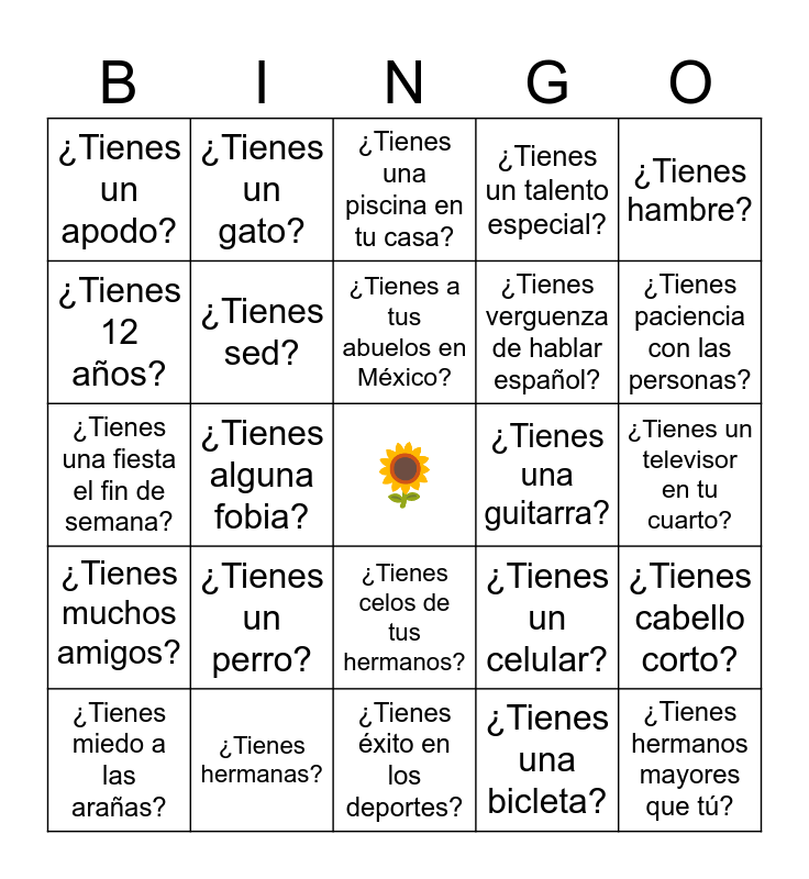 This bingo card has a free space and 24 words: ¿Tienes un perro?, ¿Tienes hermanas?, ¿Tienes a tus abuelos en México?, ¿Tienes miedo a las arañas?, ¿Tienes hambre?, ¿Tienes un apodo?, ¿Tienes 12 años?, ¿Tienes un gato?, ¿Tienes una guitarra?, ¿Tienes celos de tus hermanos?, ¿Tienes verguenza de hablar español?, ¿Tienes una fiesta el fin de semana?, ¿Tienes un celular?, ¿Tienes cabello corto?, ¿Tienes sed?, ¿Tienes una bicleta?, ¿Tienes un televisor en tu cuarto?, ¿Tienes una piscina en tu casa?, ¿Tienes paciencia con las personas?, ¿Tienes alguna fobia?, ¿Tienes hermanos mayores que tú?, ¿Tienes muchos amigos?, ¿Tienes un talento especial? and ¿Tienes éxito en los deportes?.