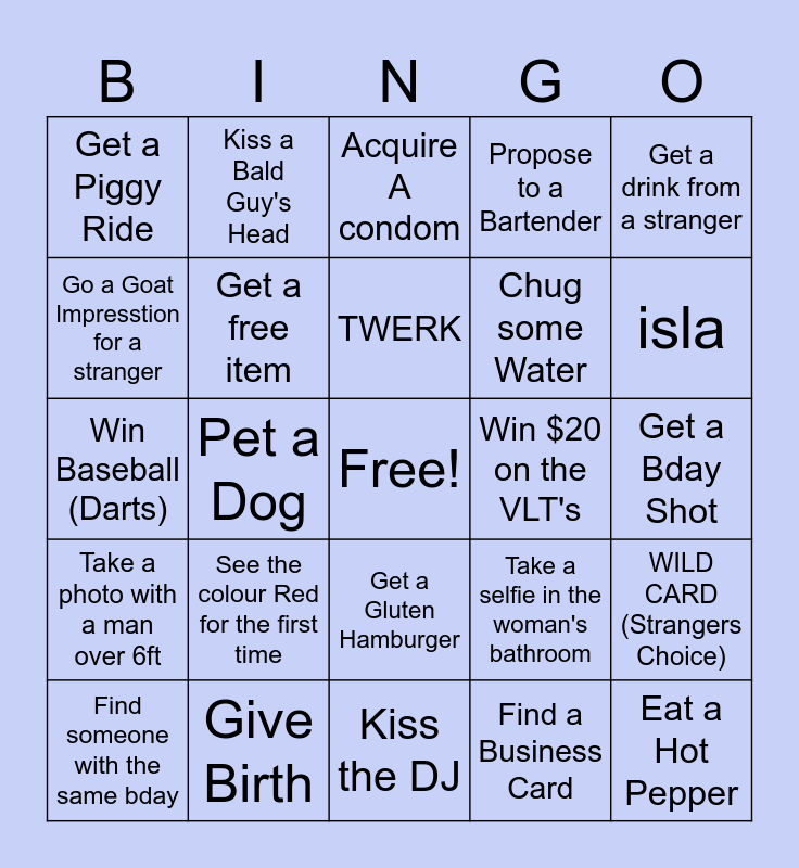 This bingo card has a free space and 32 words: Find a Business Card, Take a shot of Prairie Fire, Pet a Dog, Take a photo with someone who spilt their drink, Take a photo with a man over 6ft, Get a free item, Get a drink from a stranger, WILD CARD (Strangers Choice), Kiss a Bald Guy's Head, Get Birthdays Bumps, TWERK, Acquire A condom, Stroke a Moustache, Play VLT's, Win $20 on the VLT's, Get ID'd, Find someone with the same bday, Win Baseball (Darts), Get a Gluten Hamburger, See the colour Red for the first time, Take a selfie in the woman's bathroom, Have a slice of Bday Cake, Get a Bday Shot, Give Birth, Eat a Hot Pepper, Propose to a Bartender, Chug some Water, Go a Goat Impresstion for a stranger, Get a Piggy Ride, Kiss the DJ, Switch Clothes With Someone and isla.