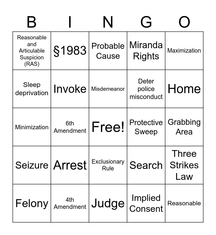 This bingo card has a free space and 30 words: 4th Amendment, 5th Amendment, 6th Amendment, Terry Stop, Reasonable and Articulable Suspicion (RAS), Probable Cause, Invoke, Exclusionary Rule, Protective Sweep, Judge, Grabbing Area, Reasonable, Implied Consent, Privacy, Home, Plain View Doctrine, Search, Seizure, Arrest, Maximization, Minimization, Warrant, §1983, Deter police misconduct, Sleep deprivation, Miranda Rights, Three Strikes Law, Felony, Misdemeanor and Evidentiary Hearing.