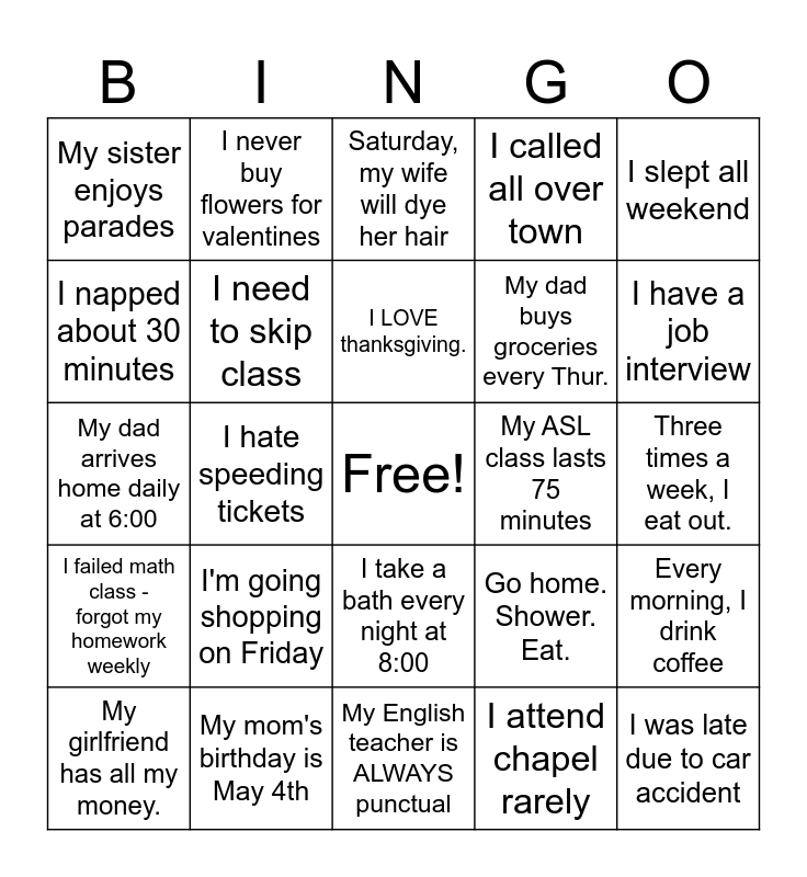 This bingo card has a free space and 24 words: I'm going shopping on Friday, My mom's birthday is May 4th, I LOVE thanksgiving., My girlfriend has all my money., I slept all weekend, My sister enjoys parades, I napped about 30 minutes, I never buy flowers for valentines, My ASL class lasts 75 minutes, I take a bath every night at 8:00, My dad buys groceries every Thur., My dad arrives home daily at 6:00, Go home. Shower. Eat., Every morning, I drink coffee, I need to skip class, I attend chapel rarely, Three times a week, I eat out., Saturday, my wife will dye her hair, I have a job interview, I hate speeding tickets, I was late due to car accident, I failed math class - forgot my homework weekly, I called all over town and My English teacher is ALWAYS punctual.