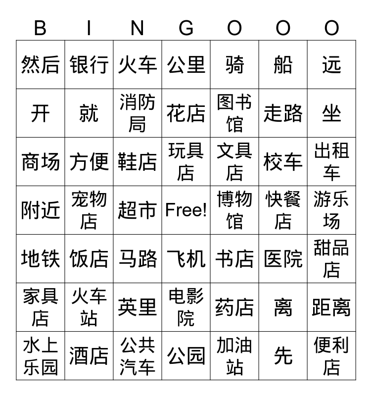 This bingo card has a free space and 61 words: 社区, 附近, 店, 方便, 超市, 离, 远, 近, 就, 距离, 公里, 英里, 船, 马路, 先, 然后, 走路, 骑, 自行车, 开, 坐, 火车, 出租车, 校车, 车, 飞机, 地铁, 警察局, 消防局, 医院, 飞机场, 火车站, 加油站, 停车场, 银行, 博物馆, 电影院, 图书馆, 书店, 花店, 药店, 鞋店, 商场, 理发店, 文具店, 游乐场, 水上乐园, 公共汽车, 公园, 玩具店, 宠物店, 五金店, 家具店, 快餐店, 酒庄, 饭店, 甜品店, 酒店, 健身中心, 便利店 and 面包店.