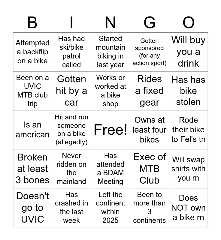 This bingo card has a free space and 24 words: Never ridden on the mainland, Has crashed in the last week, Works or worked at a bike shop, Doesn't go to UVIC, Will buy you a drink, Attempted a backflip on a bike, Been on a UVIC MTB club trip, Has had ski/bike patrol called, Owns at least four bikes, Has attended a BDAM Meeting, Rides a fixed gear, Is an american, Exec of MTB Club, Will swap shirts with you rn, Gotten hit by a car, Been to more than 3 continents, Rode their bike to Fel's tn, Started mountain biking in last year, Has has bike stolen, Hit and run someone on a bike (allegedly), Does NOT own a bike rn, Broken at least 3 bones, Gotten sponsored (for any action sport) and Left the continent within 2025.