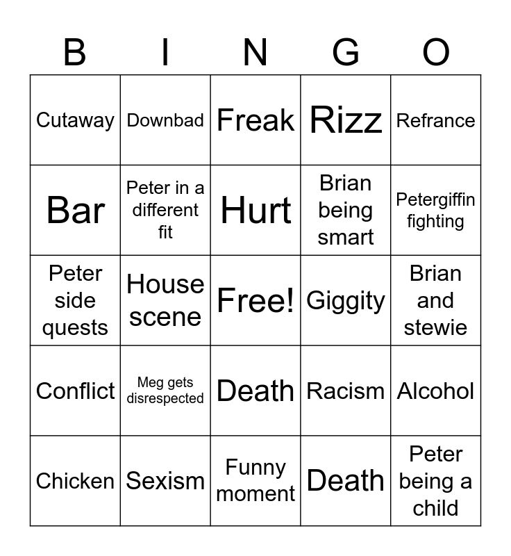 This bingo card has a free space and 24 words: Chicken, Meg gets disrespected, Hurt, Death, Refrance, Cutaway, Downbad, Freak, Giggity, Brian and stewie, Peter side quests, Peter in a different fit, Racism, Alcohol, Bar, Sexism, Funny moment, Rizz, Petergiffin fighting, Conflict, House scene, Death, Brian being smart and Peter being a child.