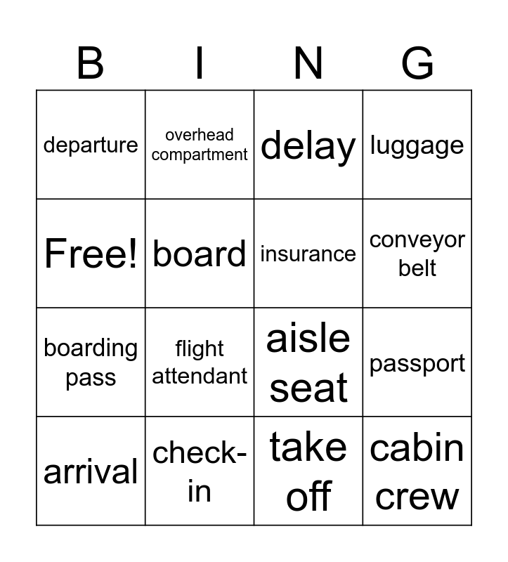 This bingo card has 16 words: check-in, passport, delay, departure, boarding pass, overhead compartment, aisle seat, take off, Free!, board, arrival, luggage, flight attendant, conveyor belt, insurance and cabin crew.