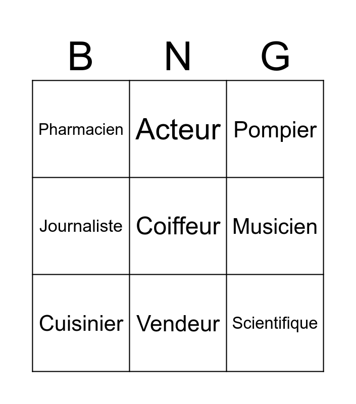 This bingo card has a free space and 20 words: Policier, Professeur, Pompier, Avocat, Chanteur, Scientifique, Dentiste, Pharmacien, Vétérinaire, Acteur, Peintre, Écrivain, Musicien, Informaticien, Cuisinier, Architecte, Vendeur, Journaliste, Agriculteur and Éleveur.