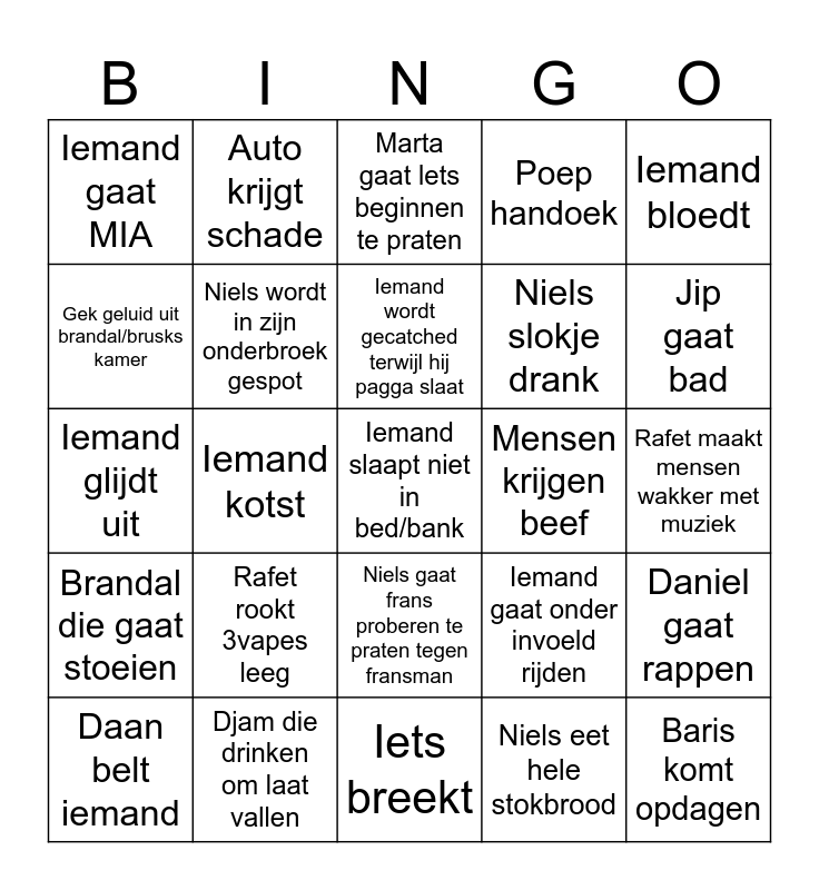 This bingo card has 25 words: Brandal die gaat stoeien, Djam die drinken om laat vallen, Iemand slaapt niet in bed/bank, Niels eet hele stokbrood, Iemand bloedt, Iemand gaat MIA, Auto krijgt schade, Marta gaat lets beginnen te praten, Mensen krijgen beef, Daniel gaat rappen, Gek geluid uit brandal/brusks kamer, Niels wordt in zijn onderbroek gespot, Iets breekt, Iemand gaat onder invoeld rijden, Jip gaat bad, Daan belt iemand, Iemand kotst, Iemand wordt gecatched terwijl hij pagga slaat, Niels slokje drank, Rafet maakt mensen wakker met muziek, Iemand glijdt uit, Rafet rookt 3vapes leeg, Niels gaat frans proberen te praten tegen fransman, Poep handoek and Baris komt opdagen.