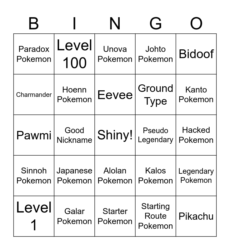 This bingo card has a free space and 24 words: Japanese Pokemon, Galar Pokemon, Eevee, Level 1, Bidoof, Paradox Pokemon, Charmander, Level 100, Pseudo Legendary, Alolan Pokemon, Ground Type, Pawmi, Kalos Pokemon, Legendary Pokemon, Hoenn Pokemon, Starting Route Pokemon, Hacked Pokemon, Unova Pokemon, Kanto Pokemon, Good Nickname, Pikachu, Sinnoh Pokemon, Johto Pokemon and Starter Pokemon.