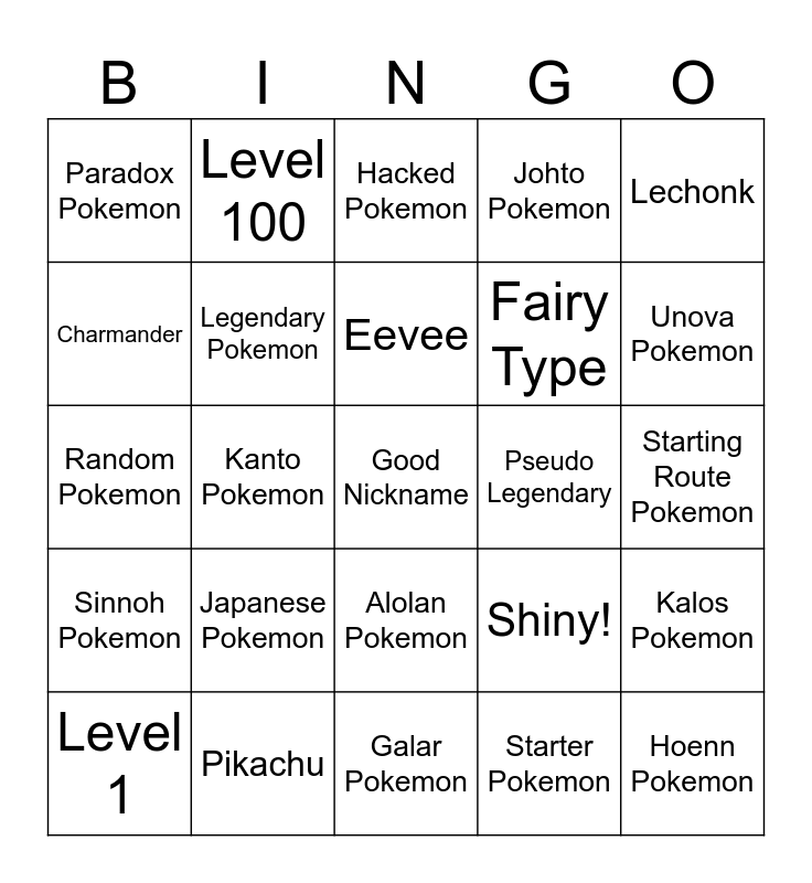 This bingo card has 25 words: Japanese Pokemon, Galar Pokemon, Eevee, Level 1, Lechonk, Paradox Pokemon, Charmander, Level 100, Pseudo Legendary, Alolan Pokemon, Fairy Type, Random Pokemon, Shiny!, Kalos Pokemon, Legendary Pokemon, Hoenn Pokemon, Starting Route Pokemon, Hacked Pokemon, Unova Pokemon, Kanto Pokemon, Good Nickname, Pikachu, Sinnoh Pokemon, Johto Pokemon and Starter Pokemon.