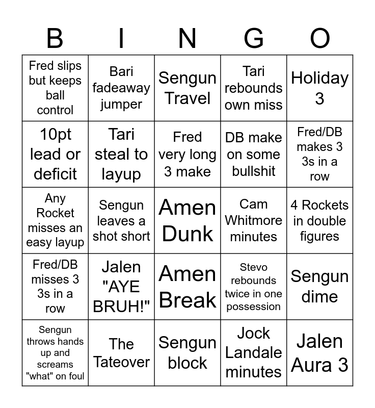 This bingo card has a free space and 24 words: Jalen "AYE BRUH!", The Tateover, Fred very long 3 make, Sengun throws hands up and screams "what" on foul, Holiday 3, Fred slips but keeps ball control, 10pt lead or deficit, Bari fadeaway jumper, Cam Whitmore minutes, Amen Break, DB make on some bullshit, Any Rocket misses an easy layup, Stevo rebounds twice in one possession, Sengun dime, Tari steal to layup, Jock Landale minutes, 4 Rockets in double figures, Sengun Travel, Fred/DB makes 3 3s in a row, Sengun leaves a shot short, Jalen Aura 3, Fred/DB misses 3 3s in a row, Tari rebounds own miss and Sengun block.