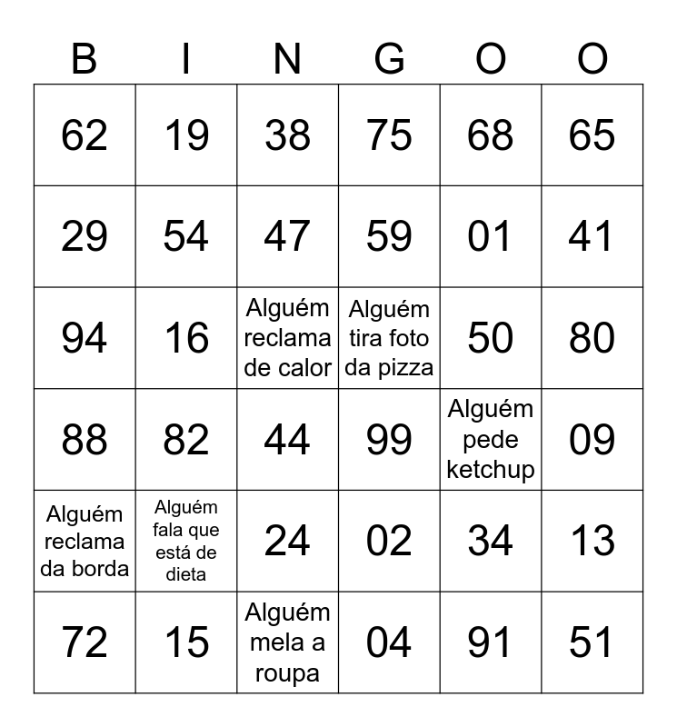 This bingo card has 36 words: 02, 24, 04, 29, 88, Alguém tira foto da pizza, 54, Alguém mela a roupa, 68, 34, 41, 75, 13, 16, 59, 62, Alguém reclama da borda, 50, 94, 38, Alguém reclama de calor, 82, 99, 44, Alguém pede ketchup, 19, 01, 15, 47, 65, 51, 72, 09, 80, Alguém fala que está de dieta and 91.