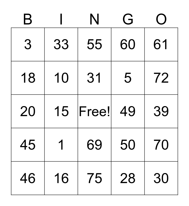 This bingo card has a free space and 24 words: 1, 16, 31, 46, 61, 3, 18, 33, 49, 69, 5, 20, 50, 70, 10, 28, 39, 55, 72, 15, 30, 45, 60 and 75.