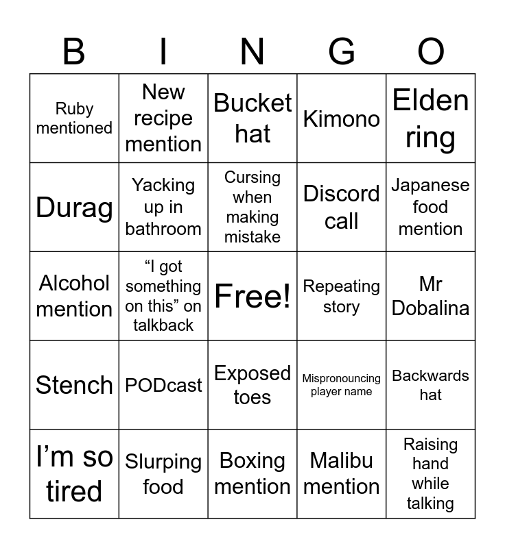 This bingo card has a free space and 29 words: I’m so tired, Goatee stroke, “I got something on this” on talkback, Running back to the board before break ends, Ruby mentioned, Bucket hat, Yacking up in bathroom, PODcast, Repeating story, Slurping food, Mr Dobalina, Raising hand while talking, Boxing mention, Malibu mention, Japanese food mention, Kiris mention, Exposed toes, Stench, Elden ring, Alcohol mention, Mispronouncing player name, Aldi, Discord call, Durag, Kimono, New recipe mention, Backwards hat, Cursing when making mistake and Called out by host.