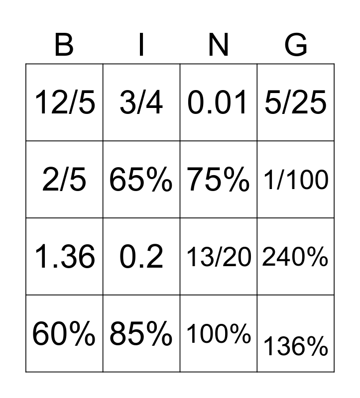 This bingo card has 16 words: 60%, 85%, 0.01, 5/25, 2/5, 3/4, 13/20, 240%, 12/5, 65%, 100%, 1/100, 1.36, 0.2, 75% and 136%.