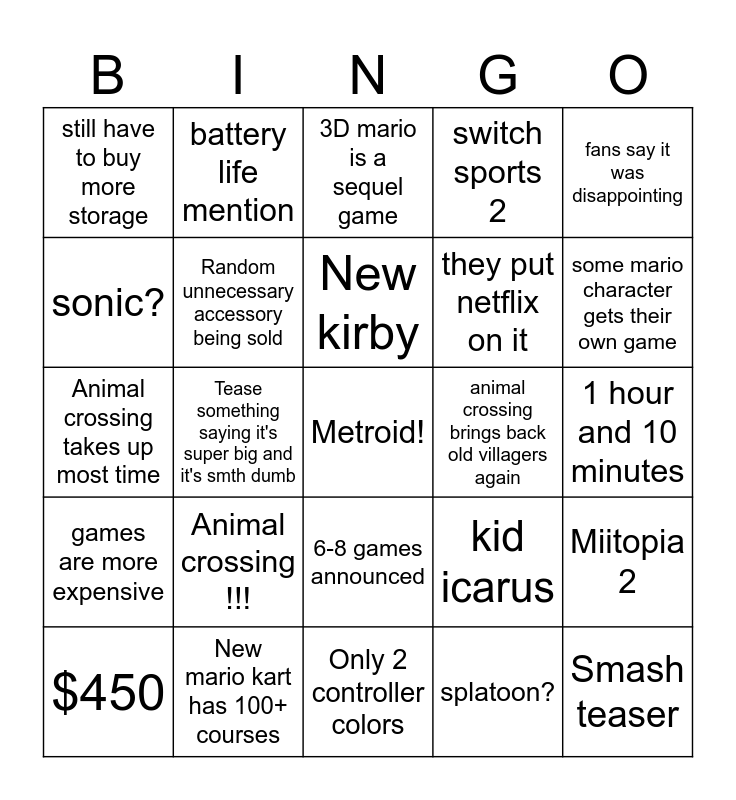 This bingo card has a free space and 24 words: Animal crossing !!!, New mario kart has 100+ courses, New kirby, $450, fans say it was disappointing, still have to buy more storage, sonic?, battery life mention, animal crossing brings back old villagers again, 6-8 games announced, they put netflix on it, Animal crossing takes up most time, kid icarus, Miitopia 2, Random unnecessary accessory being sold, splatoon?, 1 hour and 10 minutes, 3D mario is a sequel game, some mario character gets their own game, Tease something saying it's super big and it's smth dumb, Smash teaser, games are more expensive, switch sports 2 and Only 2 controller colors.