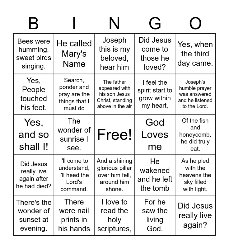 This bingo card has a free space and 29 words: There's the wonder of sunset at evening., While appeared to heavenly beings, God the Father and the Son., The wonder of sunrise I see., Oh, How lovely was the morning., Bees were humming, sweet birds singing., Joseph this is my beloved, hear him, Search, ponder and pray are the things that I must do, I'll come to understand, I'll heed the Lord's command., God Loves me, There were nail prints in his hands, Of the fish and honeycomb, he did truly eat., Did Jesus really live again?, I love to read the holy scriptures,, For he saw the living God., Joseph's humble prayer was answered and he listened to the Lord., Joseph saw the God of love, And a shining glorious pillar over him fell, around him shone., Did Jesus really live again after he had died?, Yes, when the third day came., Yes, and so shall I!, He wakened and he left the tomb, And a spear wound in his side, I feel the spirit start to grow within my heart,, Yes, People touched his feet., Did Jesus come to those he loved?, He called Mary's Name, As he pled with the heavens the sky filled with light., The father appeared with his son Jesus Christ, standing above in the air and So many choices with so much at stake..