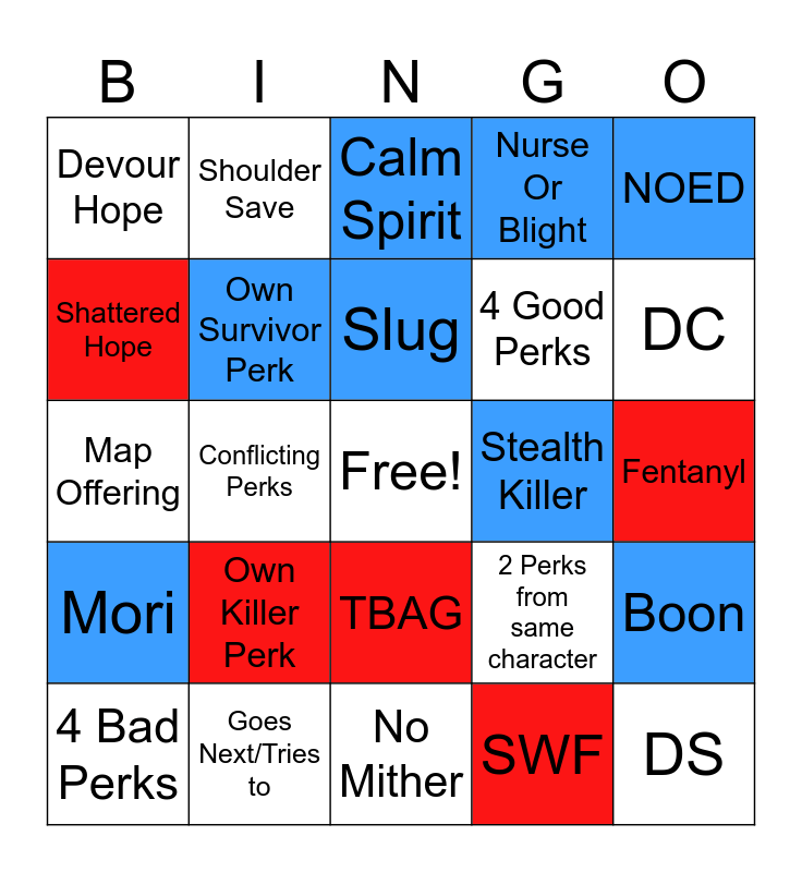 This bingo card has a free space and 24 words: Own Killer Perk, Goes Next/Tries to, Slug, 4 Bad Perks, NOED, Devour Hope, Shattered Hope, Shoulder Save, Stealth Killer, TBAG, 4 Good Perks, Map Offering, 2 Perks from same character, Boon, Own Survivor Perk, SWF, Fentanyl, Calm Spirit, DC, Conflicting Perks, DS, Mori, Nurse Or Blight and No Mither.