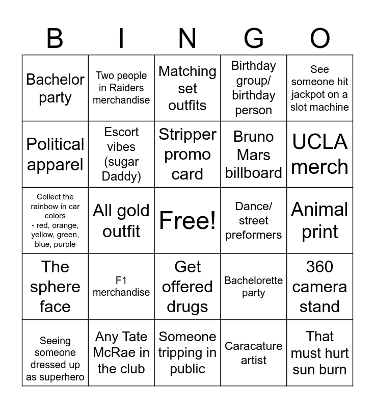 This bingo card has a free space and 24 words: Seeing someone dressed up as superhero, F1 merchandise, Stripper promo card, Caracature artist, See someone hit jackpot on a slot machine, Bachelor party, Two people in Raiders merchandise, Matching set outfits, Dance/ street preformers, Animal print, Collect the rainbow in car colors - red, orange, yellow, green, blue, purple, Escort vibes (sugar Daddy), Bachelorette party, 360 camera stand, Political apparel, Any Tate McRae in the club, Someone tripping in public, Birthday group/ birthday person, UCLA merch, The sphere face, All gold outfit, Get offered drugs, Bruno Mars billboard and That must hurt sun burn.