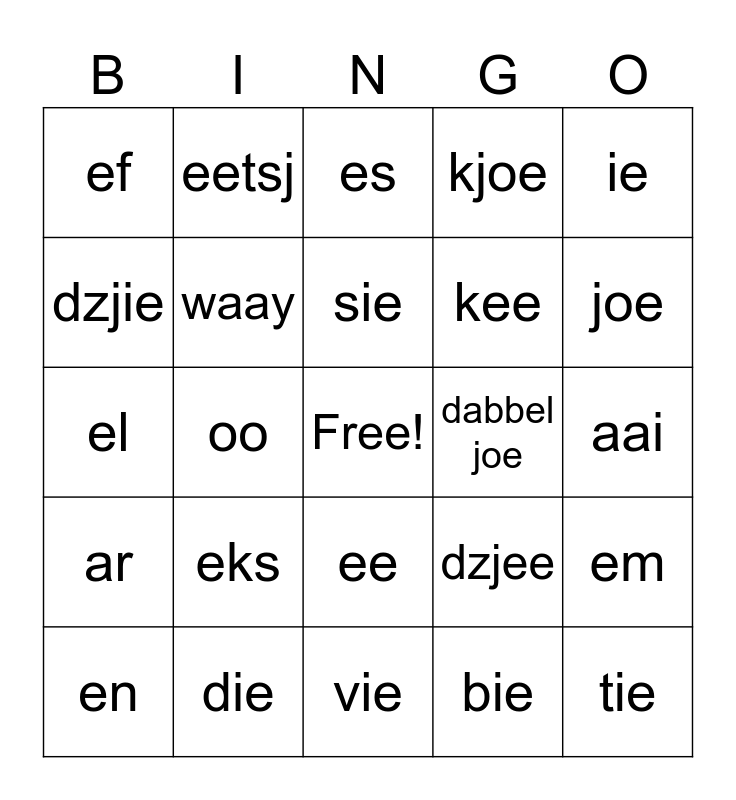 This bingo card has a free space and 26 words: ee, bie, sie, die, ie, ef, dzjie, eetsj, aai, dzjee, kee, el, em, en, oo, pie, kjoe, ar, es, tie, joe, vie, dabbel joe, eks, waay and zed.
