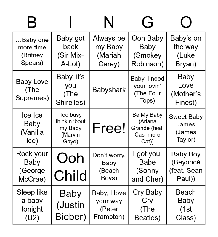 This bingo card has a free space and 24 words: Ooh Child, Baby (Justin Bieber), Babyshark, Sleep like a baby tonight (U2), Baby’s on the way (Luke Bryan), …Baby one more time (Britney Spears), Baby Love (The Supremes), Baby got back (Sir Mix-A-Lot), Be My Baby (Ariana Grande (feat. Cashmere Cat)), Don’t worry, Baby (Beach Boys), Baby, I need your lovin’ (The Four Tops), Ice Ice Baby (Vanilla Ice), I got you, Babe (Sonny and Cher), Baby Boy (Beyoncé (feat. Sean Paul)), Baby, it’s you (The Shirelles), Cry Baby Cry (The Beatles), Sweet Baby James (James Taylor), Always be my Baby (Mariah Carey), Baby Love (Mother’s Finest), Too busy thinkin ‘bout my Baby (Marvin Gaye), Beach Baby (1st Class), Rock your Baby (George McCrae), Ooh Baby Baby (Smokey Robinson) and Baby, I love your way (Peter Frampton).