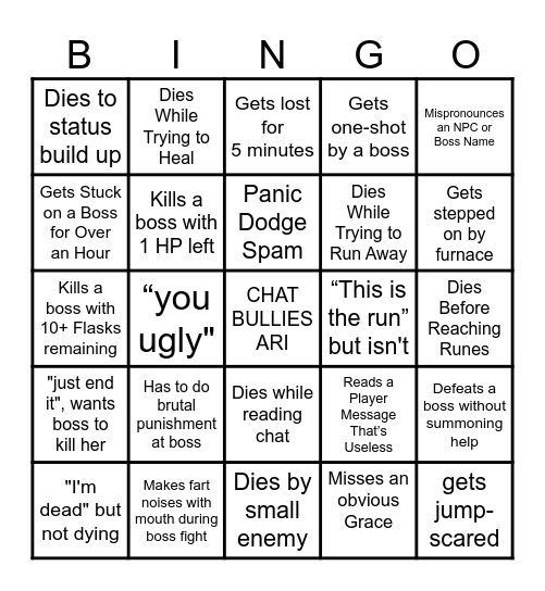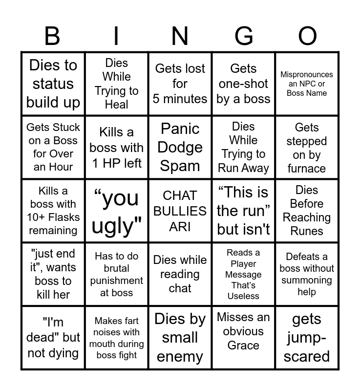 This bingo card has a free space and 24 words: Has to do brutal punishment at boss, Makes fart noises with mouth during boss fight, Panic Dodge Spam, "I'm dead" but not dying, Mispronounces an NPC or Boss Name, Dies to status build up, Gets Stuck on a Boss for Over an Hour, Dies While Trying to Heal, “This is the run” but isn't, Dies while reading chat, Dies While Trying to Run Away, Kills a boss with 10+ Flasks remaining, Reads a Player Message That’s Useless, Defeats a boss without summoning help, Kills a boss with 1 HP left, Misses an obvious Grace, Dies Before Reaching Runes, Gets lost for 5 minutes, Gets stepped on by furnace, “you ugly", gets jump-scared, "just end it", wants boss to kill her, Gets one-shot by a boss and Dies by small enemy.