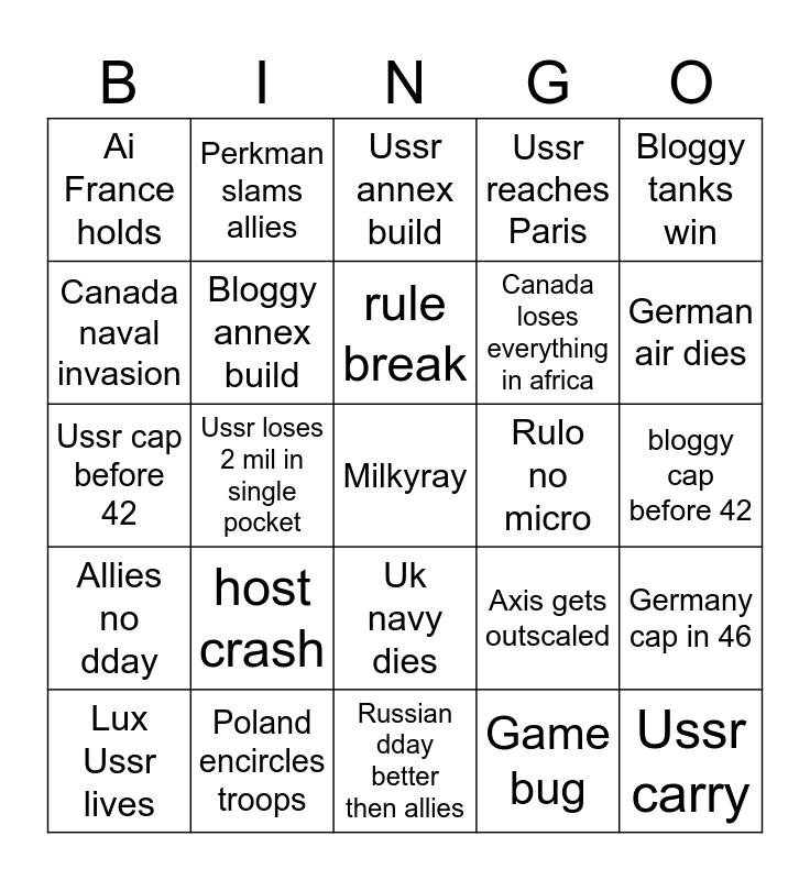 This bingo card has a free space and 24 words: host crash, Poland encircles troops, rule break, Lux Ussr lives, Bloggy tanks win, Ai France holds, Canada naval invasion, Perkman slams allies, Rulo no micro, Uk navy dies, Canada loses everything in africa, Ussr cap before 42, Axis gets outscaled, Germany cap in 46, Bloggy annex build, Game bug, bloggy cap before 42, Ussr annex build, German air dies, Ussr loses 2 mil in single pocket, Ussr carry, Allies no dday, Ussr reaches Paris and Russian dday better then allies.