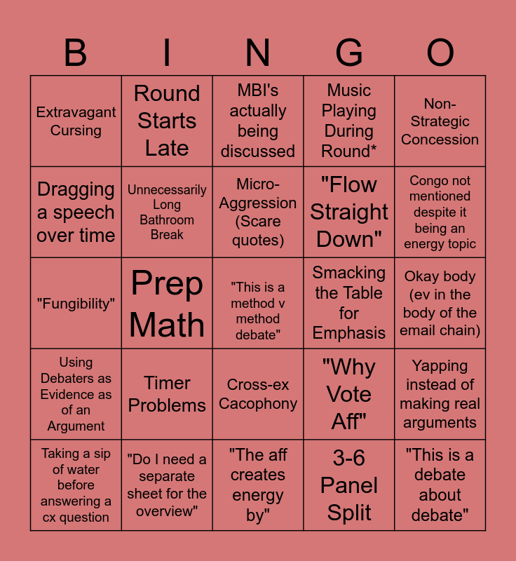 This bingo card has a free space and 24 words: Timer Problems, "Do I need a separate sheet for the overview", Micro-Aggression (Scare quotes), Taking a sip of water before answering a cx question, Non-Strategic Concession, Extravagant Cursing, Dragging a speech over time, Round Starts Late, Smacking the Table for Emphasis, Cross-ex Cacophony, "Flow Straight Down", "Fungibility", "Why Vote Aff", Yapping instead of making real arguments, Unnecessarily Long Bathroom Break, 3-6 Panel Split, Okay body (ev in the body of the email chain), MBI's actually being discussed, Congo not mentioned despite it being an energy topic, Prep Math, "This is a debate about debate", Using Debaters as Evidence as of an Argument, Music Playing During Round* and "The aff creates energy by".
