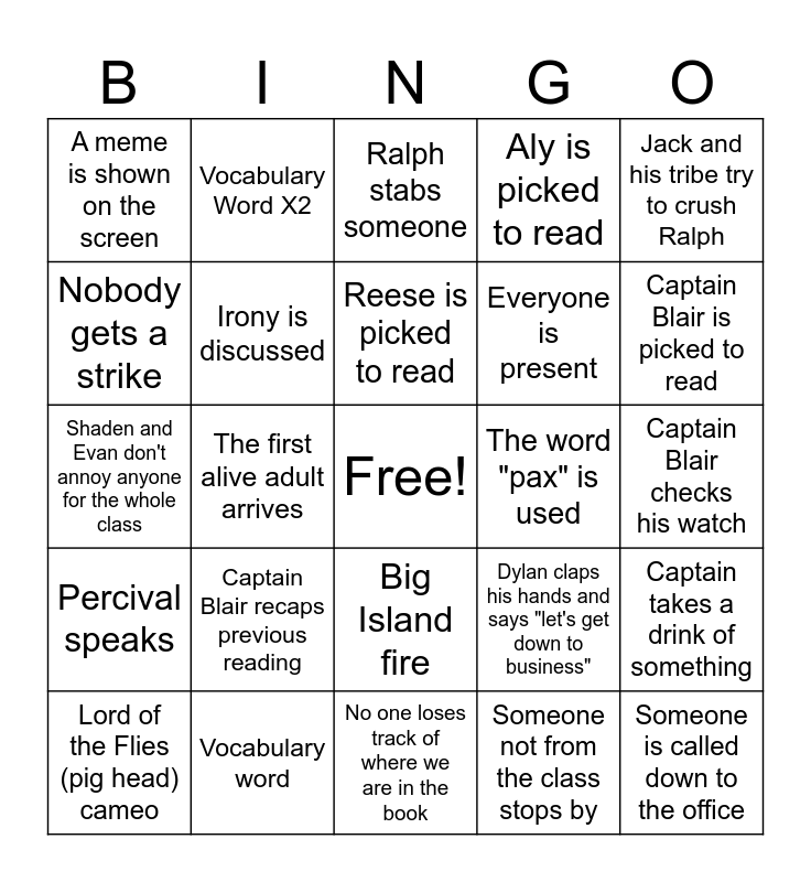 This bingo card has a free space and 29 words: Lord of the Flies (pig head) cameo, Roger is out for blood, The first alive adult arrives, Ralph cries, A meme is shown on the screen, Ralph stabs someone, Irony is discussed, Captain Blair recaps previous reading, The word "pax" is used, Vocabulary word, Captain Blair checks his watch, Someone is called down to the office, No one loses track of where we are in the book, Someone not from the class stops by, Captain Blair is picked to read, Ralph is betrayed, Big Island fire, Percival speaks, Jack and his tribe try to crush Ralph, Shaden and Evan don't annoy anyone for the whole class, Dylan claps his hands and says "let's get down to business", Jada talks about how much she loves Kinder Buenos, Everyone is present, Nobody gets a strike, Aly is picked to read, Vocabulary Word X2, Captain takes a drink of something, Reese is picked to read and Lilly is picked to read.