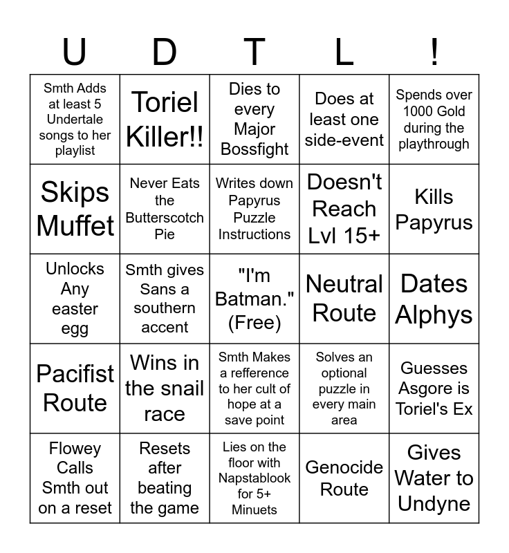 This bingo card has a free space and 24 words: Wins in the snail race, Resets after beating the game, Writes down Papyrus Puzzle Instructions, Flowey Calls Smth out on a reset, Spends over 1000 Gold during the playthrough, Smth Adds at least 5 Undertale songs to her playlist, Skips Muffet, Toriel Killer!!, Neutral Route, Smth Makes a refference to her cult of hope at a save point, Doesn't Reach Lvl 15+, Unlocks Any easter egg, Solves an optional puzzle in every main area, Guesses Asgore is Toriel's Ex, Never Eats the Butterscotch Pie, Genocide Route, Dates Alphys, Dies to every Major Bossfight, Kills Papyrus, Smth gives Sans a southern accent, Gives Water to Undyne, Pacifist Route, Does at least one side-event and Lies on the floor with Napstablook for 5+ Minuets.