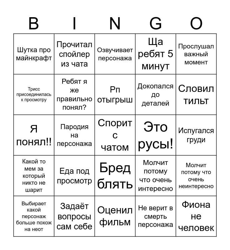 This bingo card has a free space and 24 words: Еда под просмотр, Задаёт вопросы сам себе, Рп отыгрыш, Выбирает какой персонаж больше похож на неот, Прослушал важный момент, Шутка про майнкрафт, Трисс присоединилась к просмотру, Прочитал спойлер из чата, Это русы!, Бред блять, Докопался до деталей, Я понял!!, Молчит потому что очень интересно, Молчит потому что очень неинтересно, Ребят я же правильно понял?, Не верит в смерть персонажа, Испугался груди, Озвучивает персонажа, Словил тильт, Пародия на персонажа, Фиона не человек, Какой то мем за который никто не шарит, Ща ребят 5 минут and Оценил фильм.