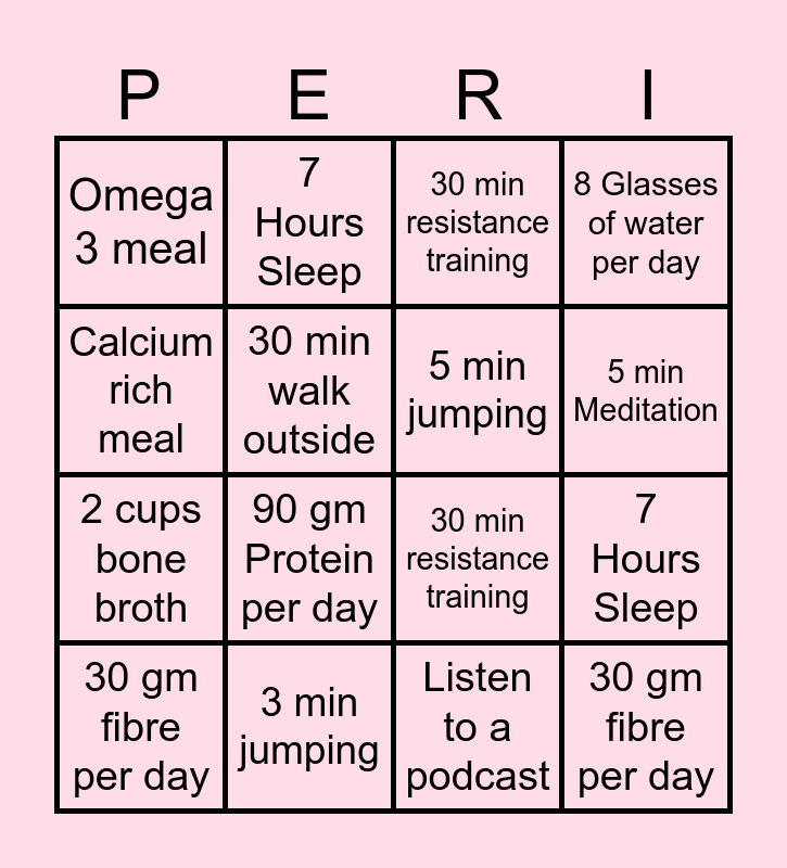 This bingo card has 20 words: 7 Hours Sleep, 90 gm Protein per day, 30 min resistance training, 30 min walk outside, 30 gm fibre per day, Calcium rich meal, 3 min jumping, Omega 3 meal, 2 cups bone broth, 7 Hours Sleep, 90 gm Protein per day, 30 min resistance training, 30 min walk outside, 30 gm fibre per day, 5 min jumping, 30 min resistance training, 5 min Meditation, 8 Glasses of water per day, Listen to a podcast and Read a book for 30 mins.