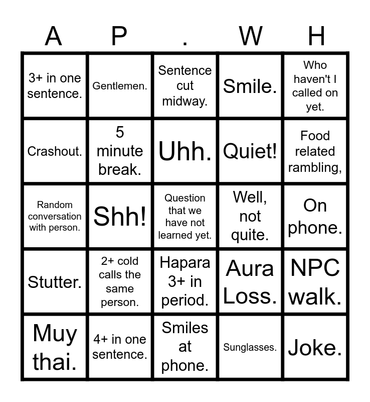 This bingo card has 38 words: Goes to the corner., Guys, knock it off., Mentions random place., 5 minute break., NPC walk., 2+ cold calls the same person., Uhh., Um., Who haven't I called on yet., Quiet!, Shh!, Smile., Question that we have not learned yet., On phone., Crashout., Stutter., Asks 2+ people the same question., Sentence cut midway., You're on the money., Well, not quite., 3+ in one sentence., 4+ in one sentence., Food related rambling,, Muy thai., Well..., Smiles at phone., Joke., Impersonates someone., Has anyone ever heard of X?, Head scratch., Hapara., Hapara 3+ in period., Sunglasses., Gentlemen., Oh, I've asked this person already., Aura Loss., Random conversation with person. and Suit..