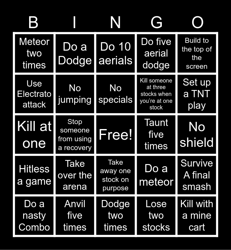 This bingo card has a free space and 28 words: Stay in the arena for the whole game, Anvil five times, Do 10 aerials, Lose two stocks, Build to the top of the screen, Meteor two times, No jumping, No specials, Taunt five times, Survive A final smash, Kill at one, Stop someone from using a recovery, Do a meteor, Kill with a mine cart, Use Electrato attack, Only lose one stock, Dodge two times, Kill someone at three stocks when you’re at one stock, Set up a TNT play, Do a nasty Combo, Do a Dodge, Burn five times, No shield, Hitless a game, Take over the arena, Take away one stock on purpose, Do five aerial dodge and 5 smash attacks.