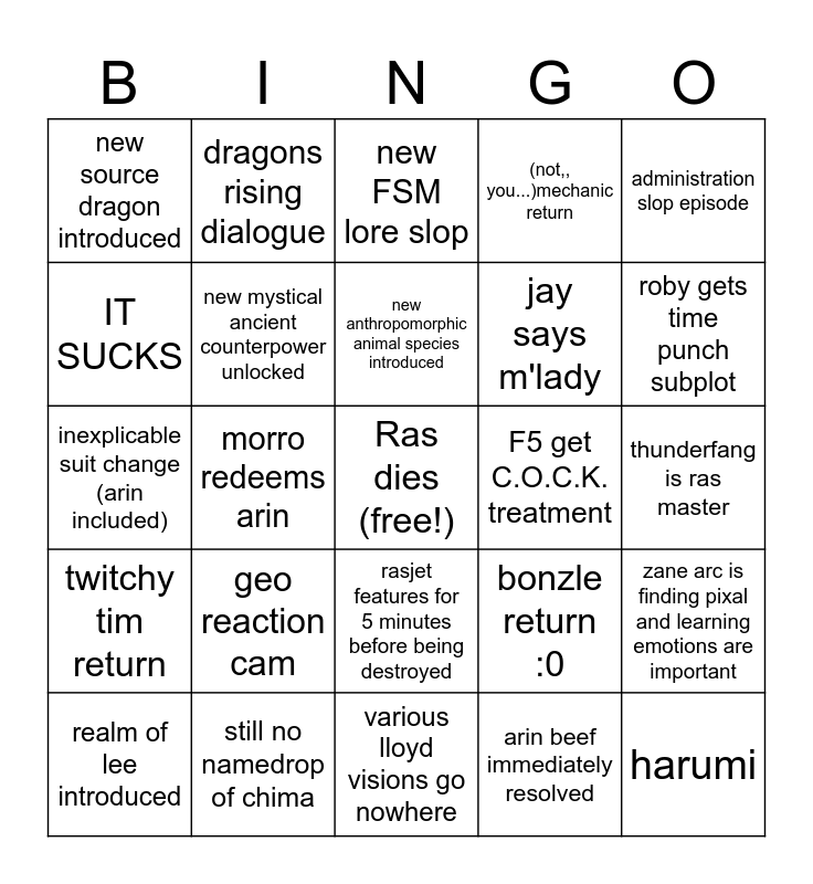 This bingo card has a free space and 24 words: geo reaction cam, still no namedrop of chima, new anthropomorphic animal species introduced, realm of lee introduced, administration slop episode, new source dragon introduced, IT SUCKS, dragons rising dialogue, F5 get C.O.C.K. treatment, rasjet features for 5 minutes before being destroyed, jay says m'lady, inexplicable suit change (arin included), bonzle return :0, zane arc is finding pixal and learning emotions are important, new mystical ancient counterpower unlocked, arin beef immediately resolved, thunderfang is ras master, new FSM lore slop, roby gets time punch subplot, morro redeems arin, harumi, twitchy tim return, (not,, you...)mechanic return and various lloyd visions go nowhere.