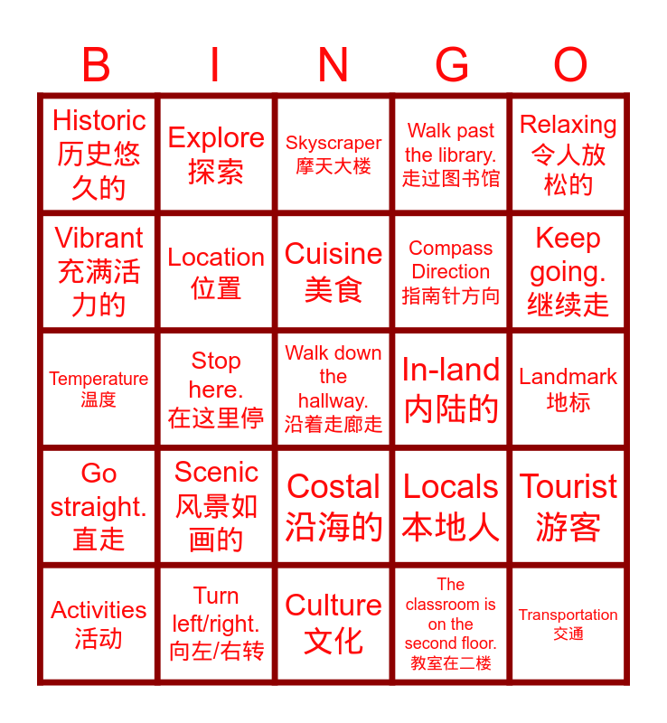 This bingo card has 25 words: Scenic 风景如画的, Culture 文化, Cuisine 美食, Activities 活动, Relaxing 令人放松的, Historic 历史悠久的, Vibrant 充满活力的, Explore 探索, In-land 内陆的, Costal 沿海的, Compass Direction 指南针方向, Temperature 温度, Locals 本地人, Tourist 游客, Location 位置, Transportation 交通, Landmark 地标, Skyscraper 摩天大楼, Keep going. 继续走, Stop here. 在这里停, Walk down the hallway. 沿着走廊走, Turn left/right. 向左/右转, Go straight. 直走, Walk past the library. 走过图书馆 and The classroom is on the second floor. 教室在二楼.