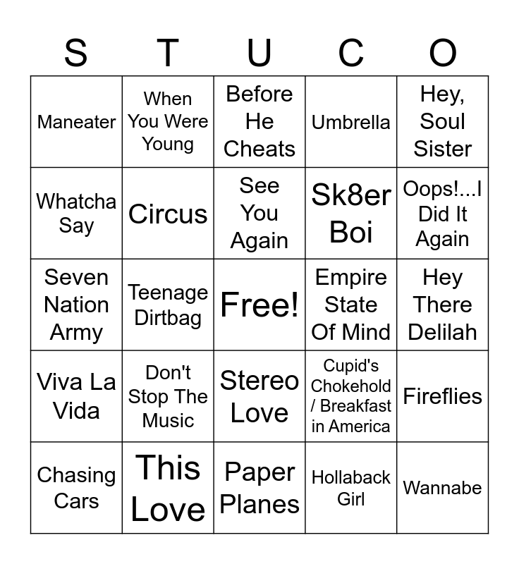 This bingo card has a free space and 45 words: Mr. Brightside, Wannabe, Complicated, Chasing Cars, Hey Ya!, Hollaback Girl, Before He Cheats, Unwritten, Hey, Soul Sister, This Love, Umbrella, Empire State Of Mind, Stereo Love, Don't Stop The Music, Back To Black, Paper Planes, Bulletproof, Seven Nation Army, Heads Will Roll - A-Trak Remix, Oops!...I Did It Again, When You Were Young, A Thousand Miles, Love Story, Maneater, Clocks, Hey There Delilah, Drops of Jupiter (Tell Me), Hot N Cold, Cupid's Chokehold / Breakfast in America, Viva La Vida, She Will Be Loved, Fireflies, Meet Me Halfway, Pocketful of Sunshine, I'm Yours, Teenage Dirtbag, Breakaway, Pon de Replay, The Sweet Escape, See You Again, Whatcha Say, Sk8er Boi, Toxic, Circus and Single Ladies (Put a Ring on It).