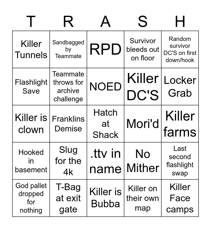 This bingo card has a free space and 24 words: Slug for the 4k, T-Bag at exit gate, NOED, God pallet dropped for nothing, Random survivor DC'S on first down/hook, Killer Tunnels, Flashlight Save, Sandbagged by Teammate, Mori'd, .ttv in name, Killer DC'S, Killer is clown, No Mither, Last second flashlight swap, Teammate throws for archive challenge, Killer on their own map, Killer farms, RPD, Locker Grab, Franklins Demise, Killer Face camps, Hooked in basement, Survivor bleeds out on floor and Killer is Bubba.