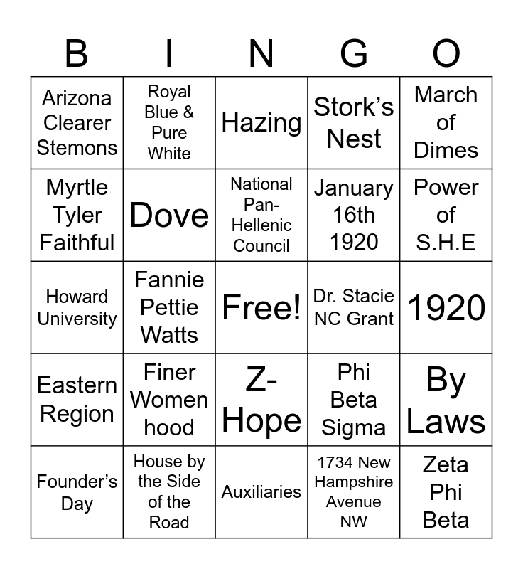 This bingo card has a free space and 30 words: House by the Side of the Road, 5 Pearls, Fannie Pettie Watts, Pearl Anna Neal, Arizona Clearer Stemons, Hazing, Dove, Z-Hope, Dr. Stacie NC Grant, Auxiliaries, 1920, Zeta Phi Beta, 1734 New Hampshire Avenue NW, Zeta Amicae, Power of S.H.E, Zetas Have Heart, Phi Beta Sigma, Eastern Region, Finer Women hood, March of Dimes, Howard University, Viola Tyler Goings, Royal Blue & Pure White, January 16th 1920, Myrtle Tyler Faithful, Stork’s Nest, By Laws, Founder’s Day, National Pan-Hellenic Council and Five Pearls.