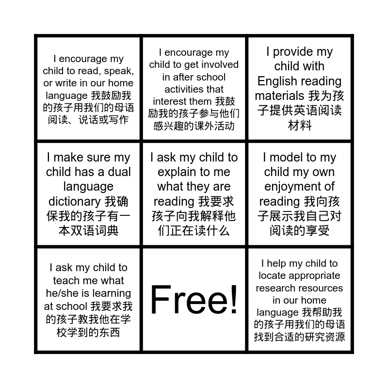 This bingo card has 10 words: Free!, I provide my child with English reading materials 我为孩子提供英语阅读材料, I encourage my child to read, speak, or write in our home language 我鼓励我的孩子用我们的母语阅读、说话或写作, I ask my child to explain to me what they are reading 我要求孩子向我解释他们正在读什么, I make sure my child has a dual language dictionary 我确保我的孩子有一本双语词典, I ask my child to teach me what he/she is learning at school 我要求我的孩子教我他在学校学到的东西, I encourage my child to get involved in after school activities that interest them 我鼓励我的孩子参与他们感兴趣的课外活动, I let my child choose books to read 我让我的孩子选择要读的书, I model to my child my own enjoyment of reading 我向孩子展示我自己对阅读的享受 and I help my child to locate appropriate research resources in our home language 我帮助我的孩子用我们的母语找到合适的研究资源.
