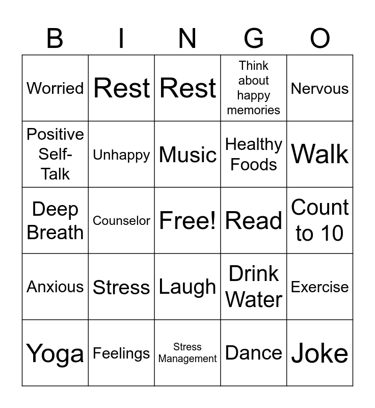 This bingo card has a free space and 24 words: Stress, Feelings, Music, Yoga, Nervous, Worried, Positive Self-Talk, Rest, Read, Laugh, Healthy Foods, Deep Breath, Drink Water, Exercise, Unhappy, Dance, Count to 10, Rest, Walk, Counselor, Joke, Anxious, Think about happy memories and Stress Management.