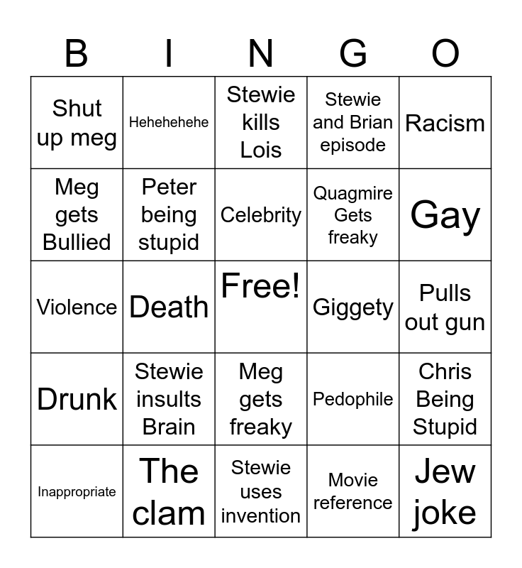 This bingo card has a free space and 24 words: Stewie insults Brain, The clam, Celebrity, Inappropriate, Racism, Shut up meg, Meg gets Bullied, Hehehehehe, Giggety, Meg gets freaky, Quagmire Gets freaky, Violence, Pedophile, Chris Being Stupid, Peter being stupid, Movie reference, Pulls out gun, Stewie kills Lois, Gay, Death, Jew joke, Drunk, Stewie and Brian episode and Stewie uses invention.