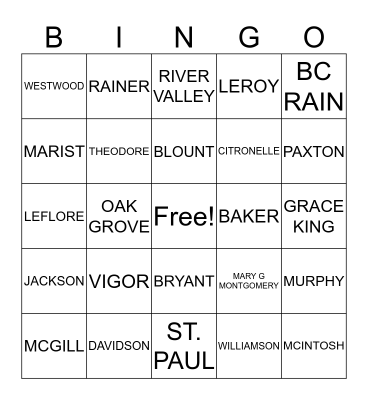This bingo card has a free space and 24 words: VIGOR, DAVIDSON, BLOUNT, MCGILL, BC RAIN, WESTWOOD, MARIST, RAINER, BAKER, BRYANT, CITRONELLE, LEFLORE, MARY G MONTGOMERY, MURPHY, THEODORE, WILLIAMSON, GRACE KING, RIVER VALLEY, PAXTON, OAK GROVE, MCINTOSH, JACKSON, LEROY and ST. PAUL.