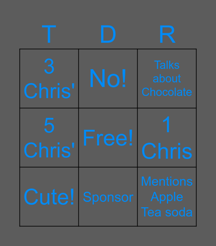 This bingo card has a free space and 8 words: 1 Chris, Talks about Chocolate, No!, Cute!, 3 Chris', Mentions Apple Tea soda, 5 Chris' and Sponsor.